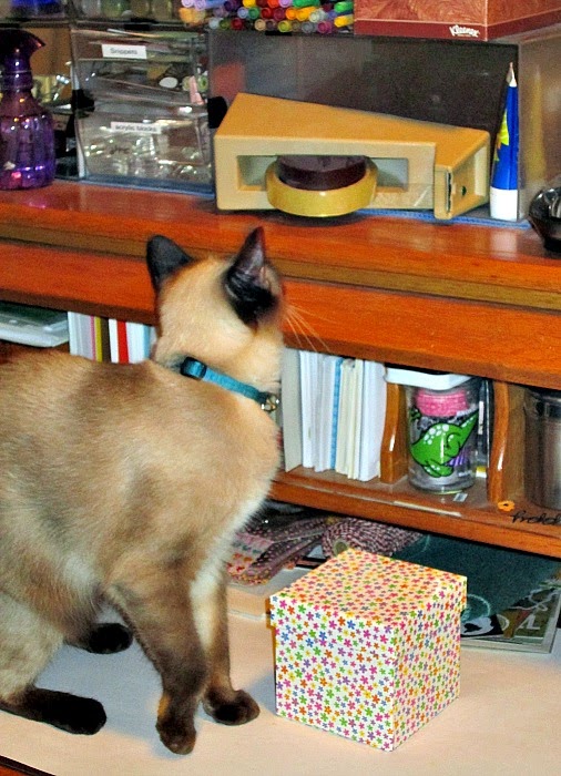 So I was trying to take a photo of several cards I made including this one, when along comes Cindy. She walks along my desk, knocking things off left and right (mostly left) and proceeded to climb up the side of my desk to the place I had the card sitting. She knocked it flat and struck a pose.